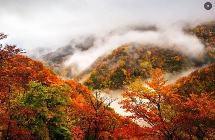 从山脚的浓郁墨绿,到山腰的金黄、橙红、深红,直至山顶的苍劲常青,冷杉、红桦、枫树、槭树、各种灌木交织成绚烂的调色板,在纯净的蓝天白云下,在缥缈的云雾缭绕中,形成无与伦比的立体画卷