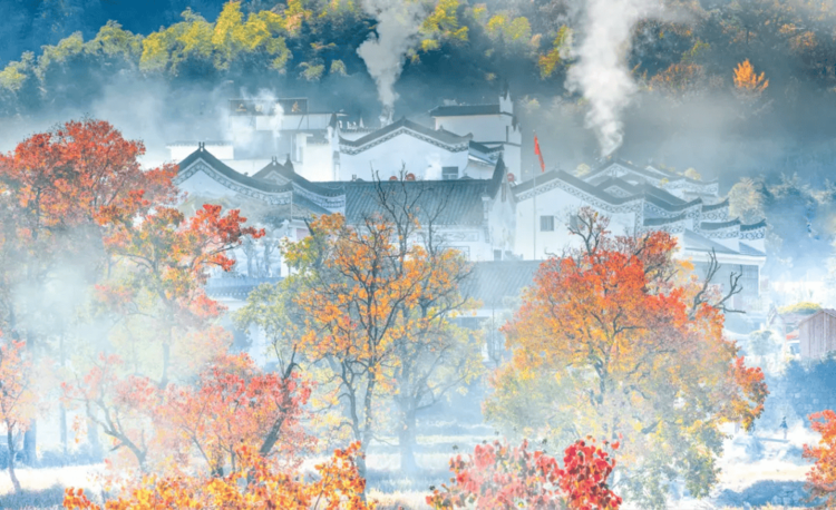 特点:乌桕树分布面积广且大,树形好看,树叶多彩,与圣人堂村徽派建筑很搭