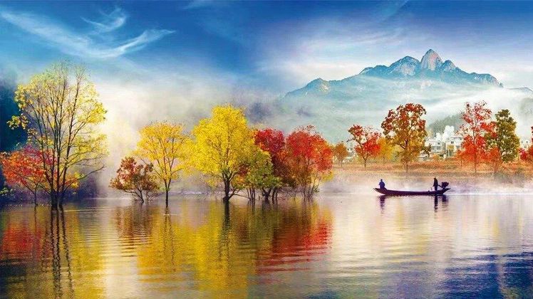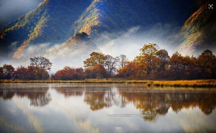 像山灵抖落的素纱,轻轻裹着湖湾里的栗树,秋阳刚漫过山顶,金黄的叶就浸在雾里,风一吹,便撒下满湖碎光,蒹葭苍苍,白露为霜,不知伊人,何时来赏