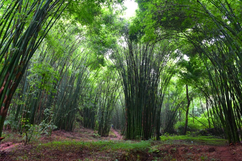 深入竹林之中,满目青翠,连阳光也收敛起来。有的路段,瀑布顺流而下,十分凉快潮湿,旁边的小径上都长了青苔。