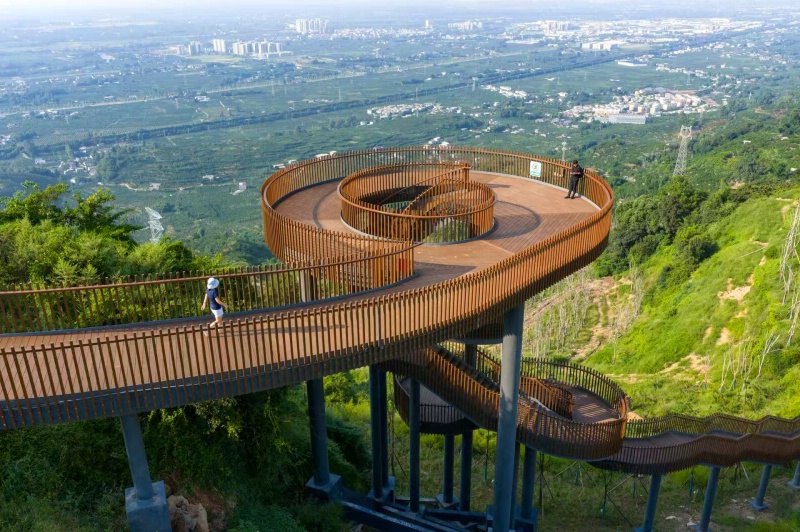 山顶建有多个观景平台,在天气好的时候,这里是成都平原看雪山的最佳去处,可以遥望四姑娘山、贡嘎山等蜀中名山,