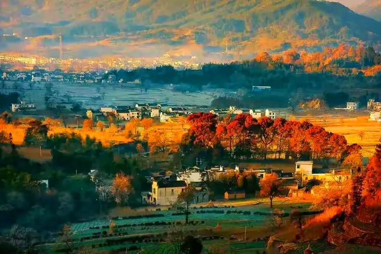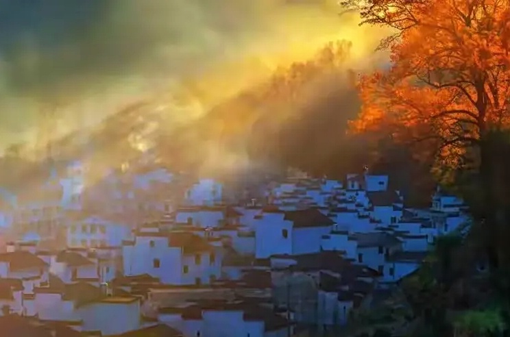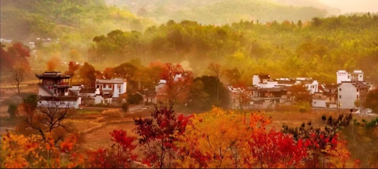 登高望远,层林尽染,白墙黑瓦,错落有致,层层叠叠,静谧悠远。依山傍水的微派古村落,与艳丽的美妙秋景形成了一幅幅水墨山水画,不聒不噪,美得刚刚好。