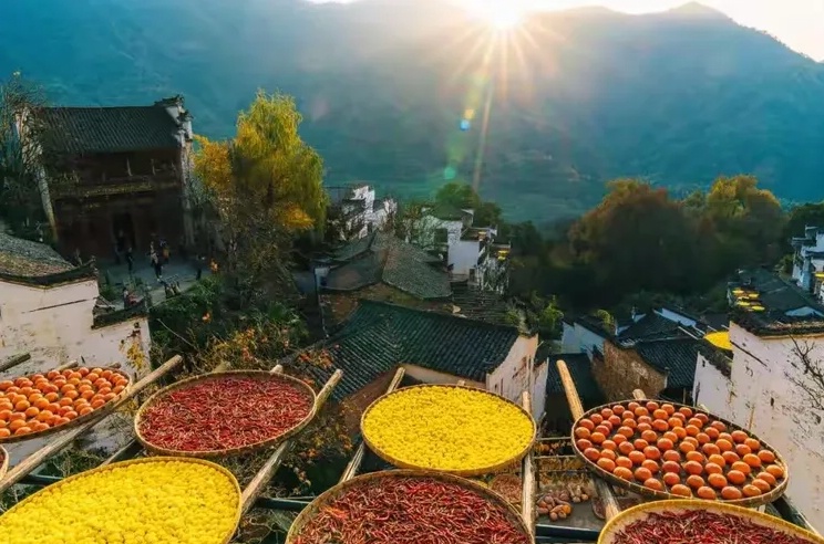 篁岭古村数百栋徽派古民居在百米落差的坡面错落有序,每当日出山头,晨曦映照,整个山间村落饱经沧桑的徽式民居土砖外墙与晒架上、圆圆晒匾里五彩缤纷丰收果实组合,绘就出世界独一无二的"晒秋"农俗景观、最美的乡村符号。