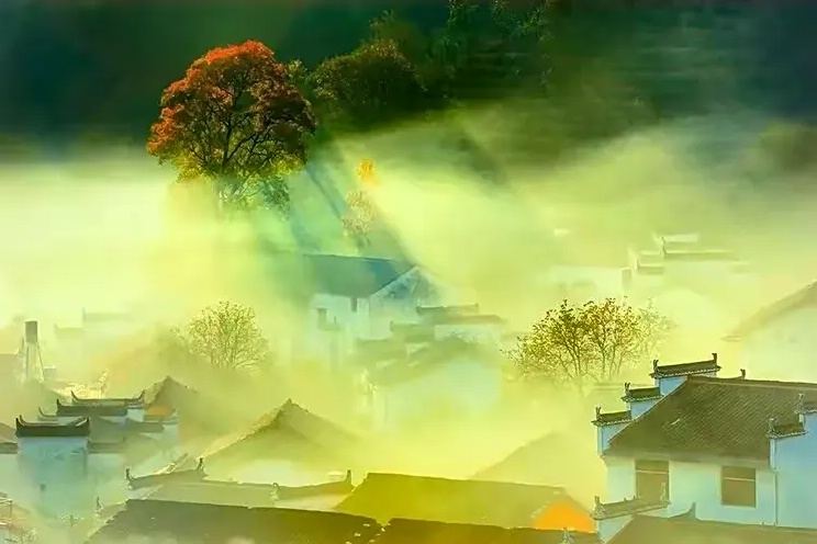 可以在清晨时分迎着朝阳醒来,最好就在5点至9点时分,让自己浸身在清晨的雾气与徽式建筑的炊烟中。看这里的晨雾与光影相依相伴、变化多端,画面简直美轮美奂。