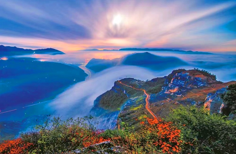 夔门日出:是长江三峡最壮丽的自然奇观之一,位于瞿塘峡西端,两岸赤甲山与白盐山对峙如门,江面狭窄处不足50米。